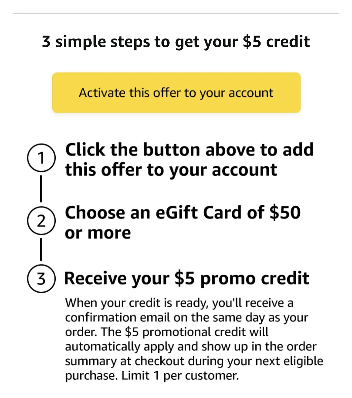 Again, here's the scoop in one sweet paragraph, bestie! If you're an active Amazon Prime Member (and only if you're an active one), you can snatch up this offer. All you gotta do is purchase an Amazon eGift card worth $50 or more in a single swoop, and bam! You're in for a $5 Amazon promotional credit. But here's the catch - you can only squeeze a maximum of $5 promotional credit out of this deal. Make sure to put that credit to good use before August 25, 2023, at 11:59 PM (PST), or it'll vanish! Also, keep in mind it's a one-time thing per Amazon Prime account. So, seize the day and grab this offer before it's gone by July 10, 2023, or until the promotional offer lasts. Happy shopping, queens! 🛍️